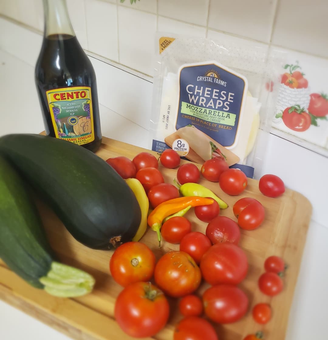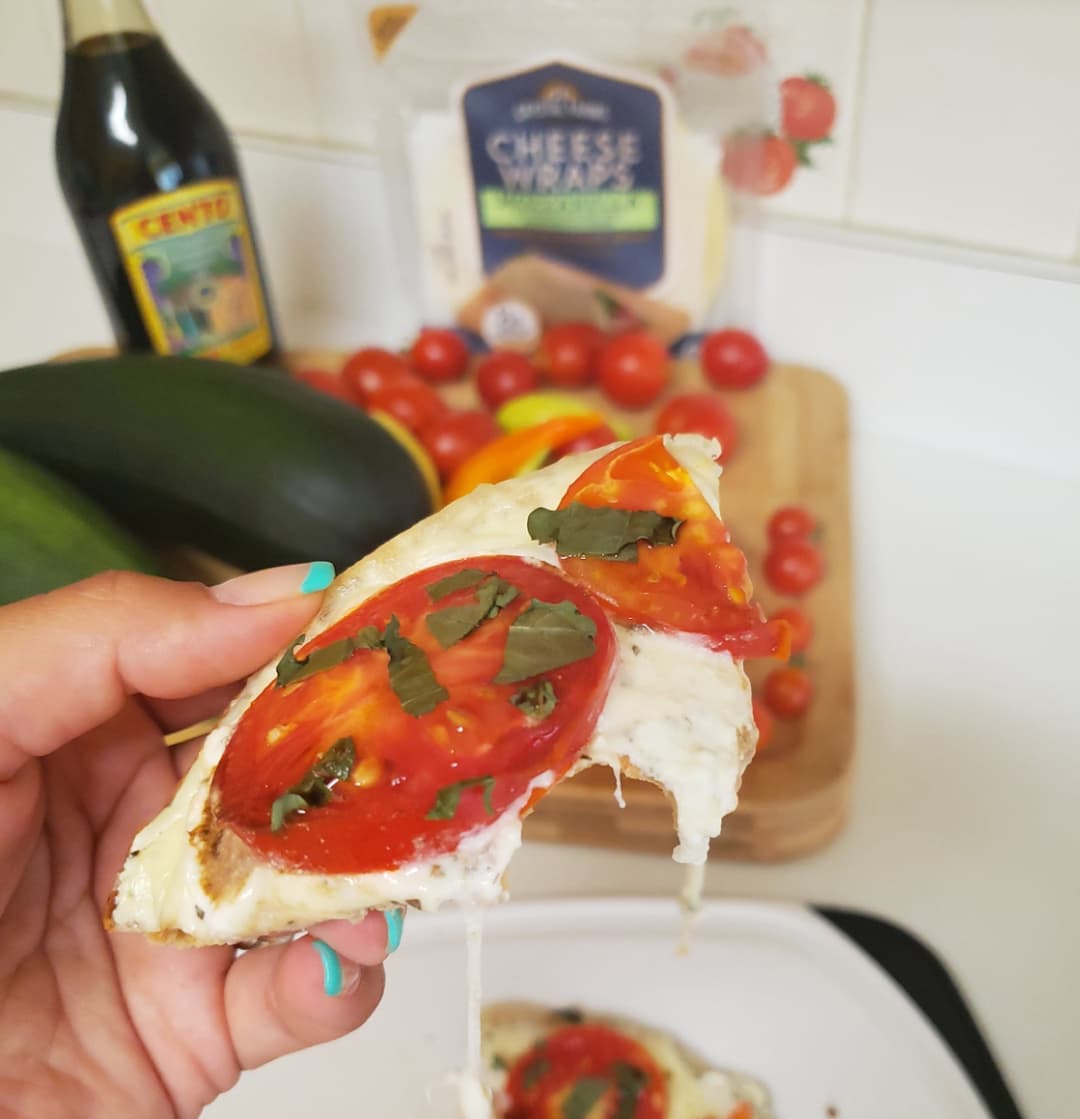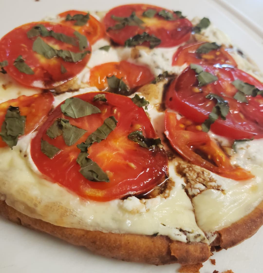 I used a Joseph’s Low Carb Pita and toasted it in the toaster oven at 350F for about 7 minutes just till light browned and crisp. Then I sliced some of my fresh tomatoes and fresh basil, minced some garlic and threw it into some ricotta with some Italian seasoning, salt and pepper. Once the pita was crisp I spread a layer of ricotta, then laid a perfectly round Crystal Cheese Wrap on top. Followed that up with more ricotta, more garlic that I sliced thin, lets be honest there is no such thing as too much garlic, then the tomatoes and fresh basil! back into the oven for another 5-8 minutes drizzle a little balsamic and BAM an epic white pie!