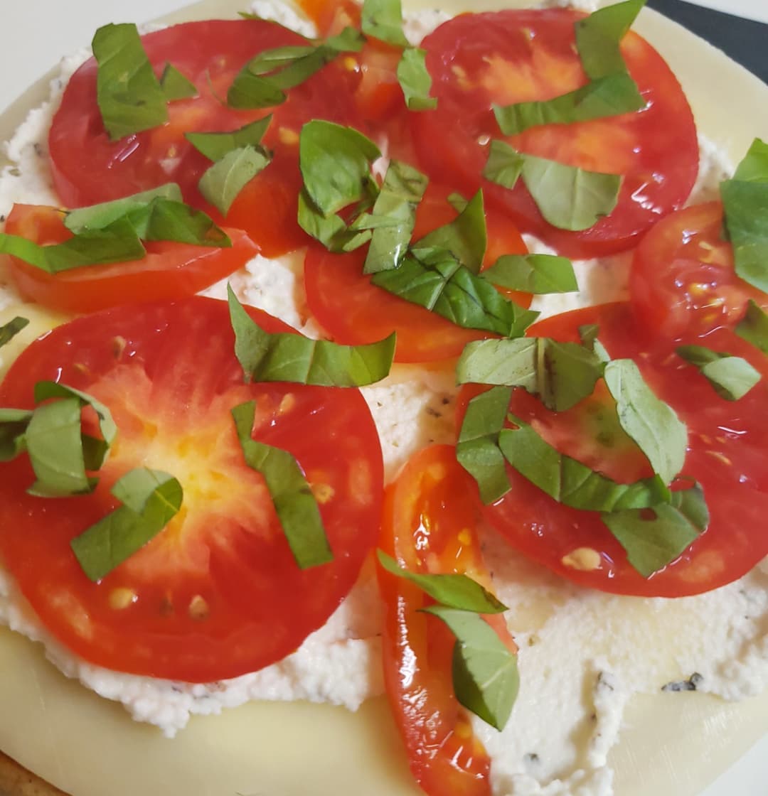 So today we had a random and unplanned trip out for lunch where I had a ton of loaded waffle fries. They were amazing, but dinner I decided to get a little healthier lol. SOOOO I have a ton of fresh tomatoes and basil from my garden. I was craving a white pie which is my favorite so I made one!