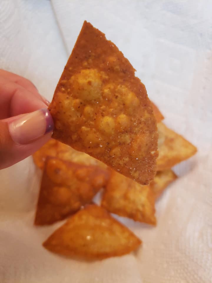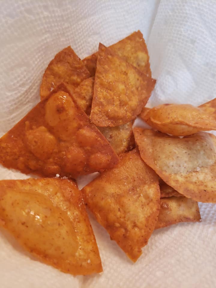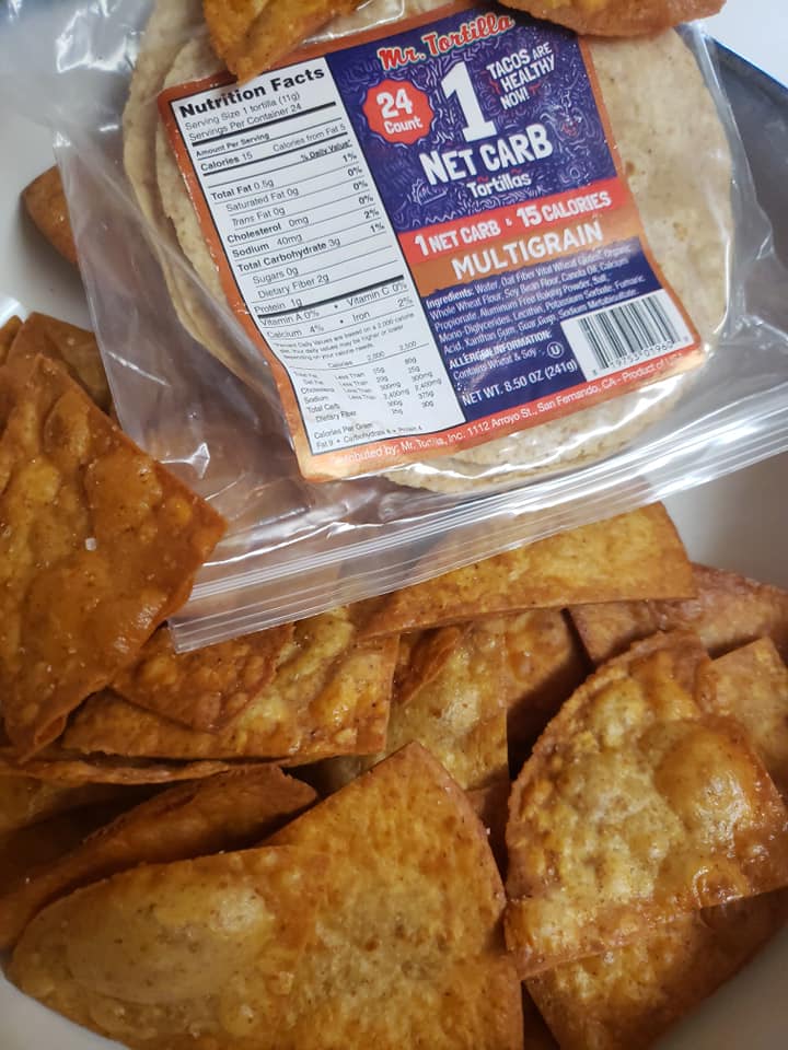 This weekend is Labor Day weekend 2021! We have people coming over for a cookout and I made this awesome taco dip BUT I wanted low carb chips. I got out my many packs of Mr. Tortilla one carb tortillas, cut them into fours or six triangles and fried them up in avocado oil! OMG can I say DELISH so THIN so CRISPY so CRUNCHY so PERFECT!