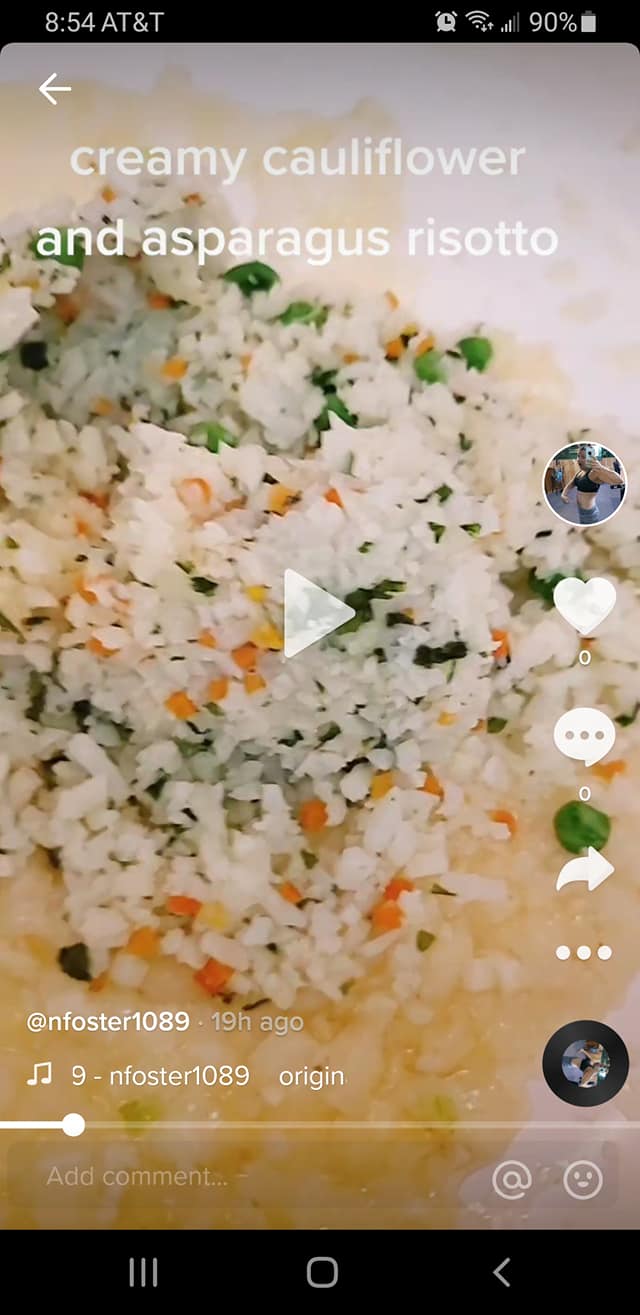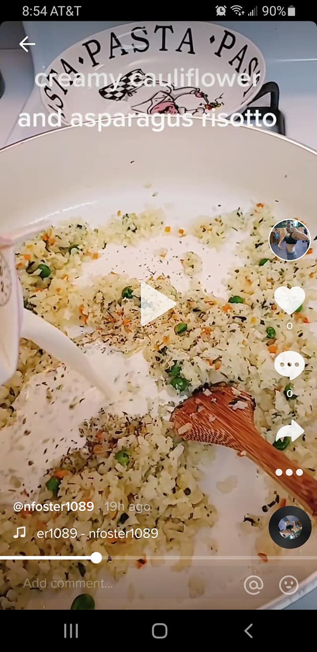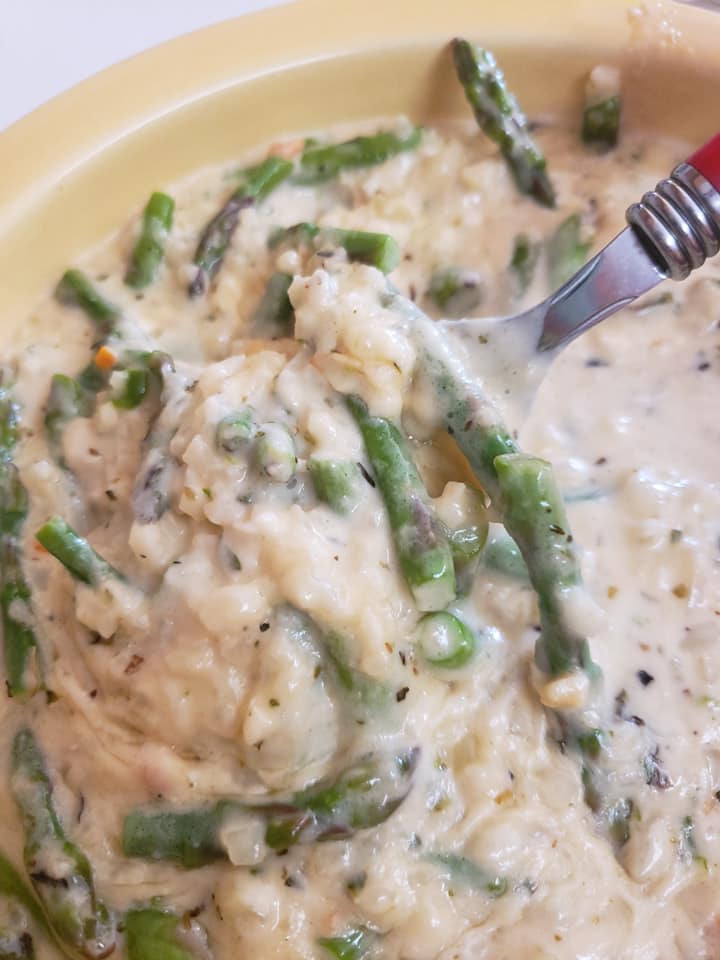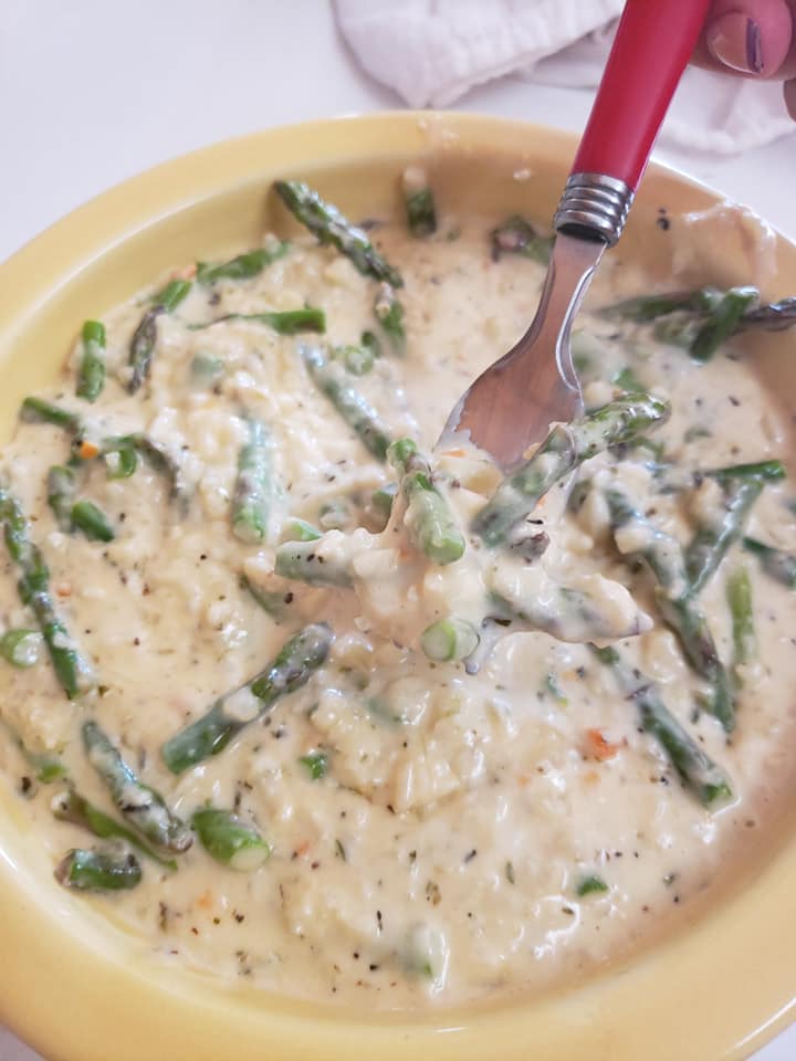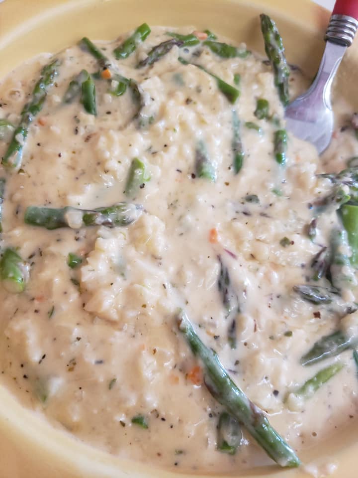 I have a ton of cauliflower rice in the freezer. I prefer the green giant frozen cauliflower rice it works great! cooks great! very versatile. SO today I made a cauliflower risotto! Now I have never made a risotto so I literally wung this recipe. I had baby asparagus and decided to use that too. It came out so very creamy and cheesy yes I had to add cheese! and literally was done in 15 minutes.