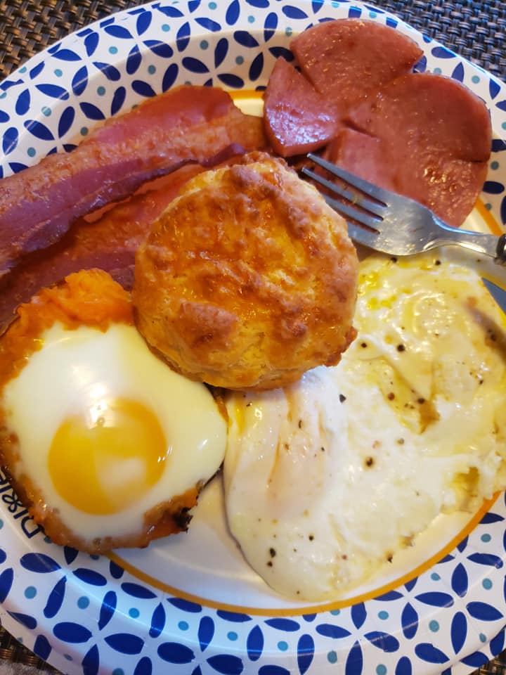 Avery had pancakes and of course since we are in jersey Pork roll is a must! If you want to know about pork roll and the history of it here in jersey click HERE In addition to pork roll, we also had a side of eggs, bacon and I made my famous seltzer biscuits which is a feature in my first and second cookbook. Joe had his egg on a biscuit with cheese and pork roll.