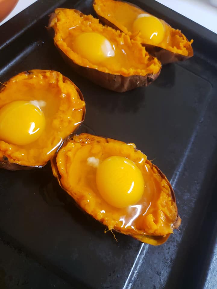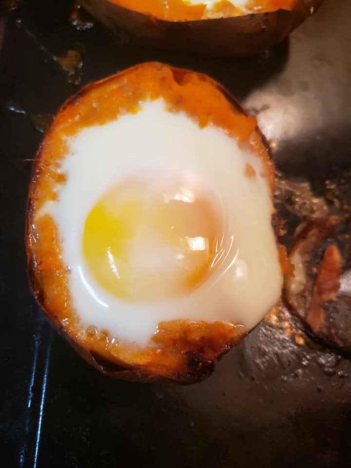 Now cooked these looked perfect HOWEVER I did over cook a little. I wanted a soft runny dippy egg and this was slightly over done. Next time I will watch the time closer and maybe just cook for 12 minutes. If you like eggs and sweet potatoes this is a must try!