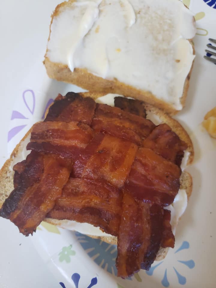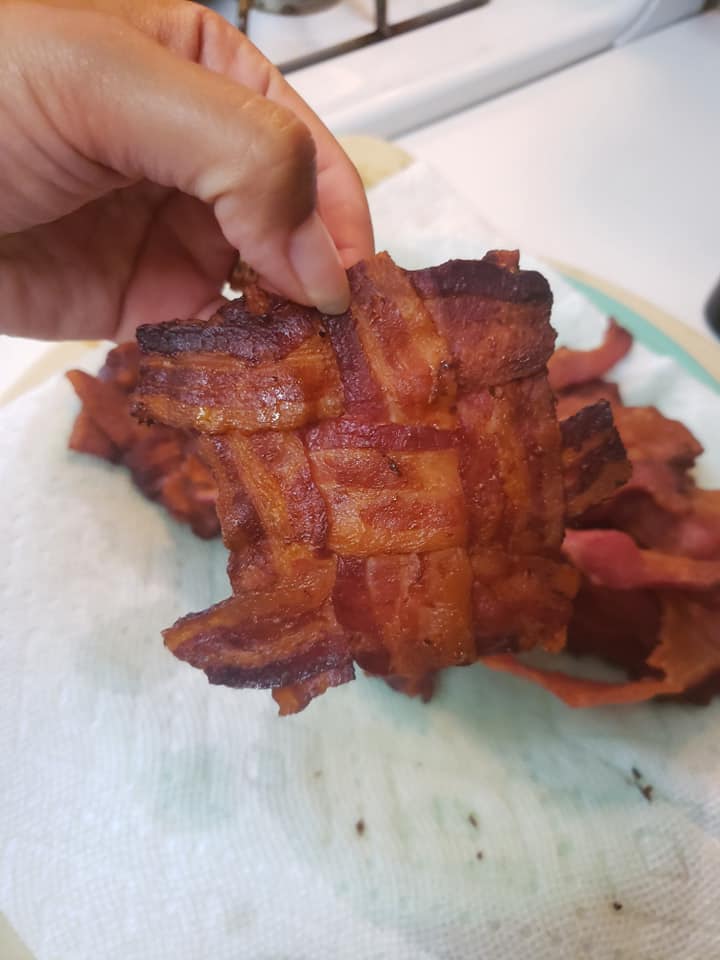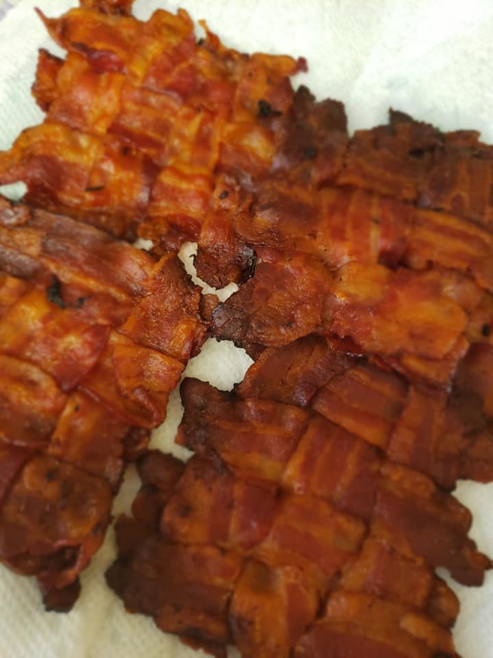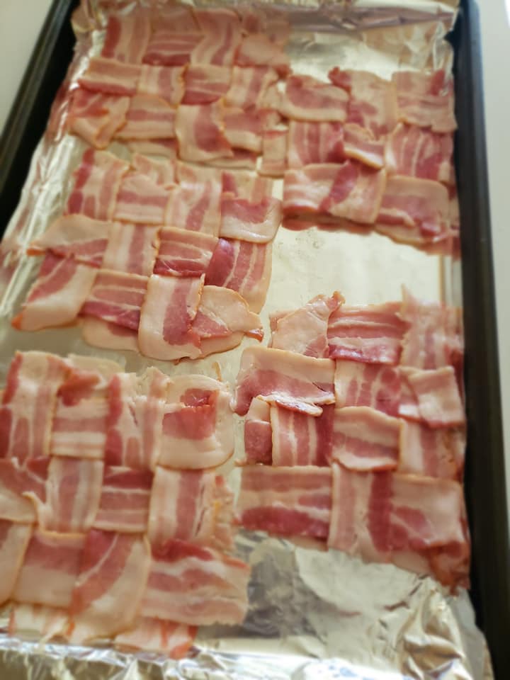 You start with a pound of bacon and cut it in half and lay 3 pieces horizontally on a foil lined baking pan and fold up every other piece slightly lay one strip vertically and fold down the folded pieces on top of the vertical piece. Repeat this step with alternating layers. Place the pan into a COLD oven and turn heat on to 365F. Once oven beeps at 365F rotate the pan and cook for 15 minutes. Carefully flip each weave and cook until desired tenderness. Like I said I like crispy bacon so I cook for a total of about 25-35 minutes. Because we cut the bacon in half it is the perfect sandwich size! You can leave the bacon whole for bigger weaves.