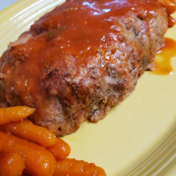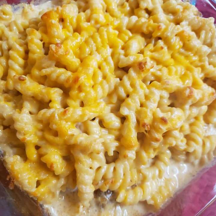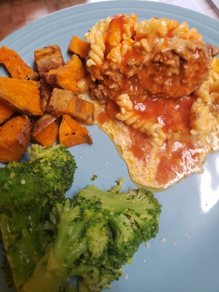 On the left we have my meatloaf recipe which I serve with a red sauce. I still included my sauce and topped the meatloaf when baking prior to adding the mac and cheese to the meatloaf. I topped with mac and cheese and baked an additional 15-20 minutes. The mac and cheese was so creamy and delish! My daughter enjoyed a bowl before dinner was even ready! I did top the cheese with some shredded cheddar cheese then when serving I drizzled some of my red sauce on top!